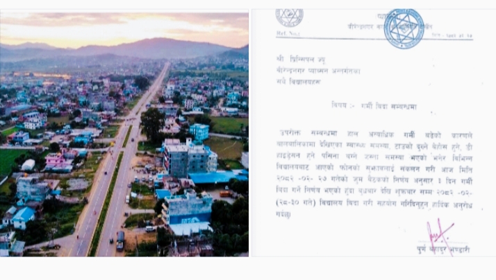 विभिन्न विद्यालयबाट आएको फोनको सुझावलाई संकलन गरी आज जुम बैठकको निर्णय अनुसार ३ दिन गर्मी बिदा गर्ने निर्णय भएको छ, उनले भने, आज÷बुधवारदेखि शुक्रबारसम्म विद्यालय बिदा लागु हुनेछ ।